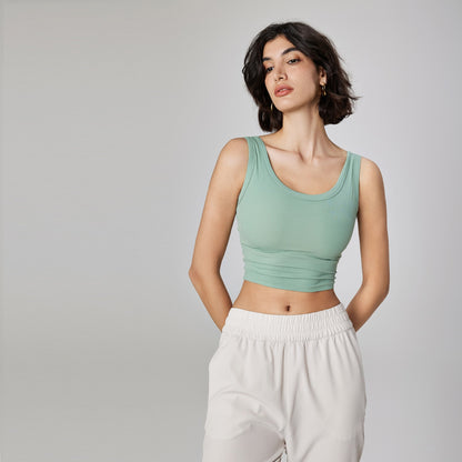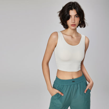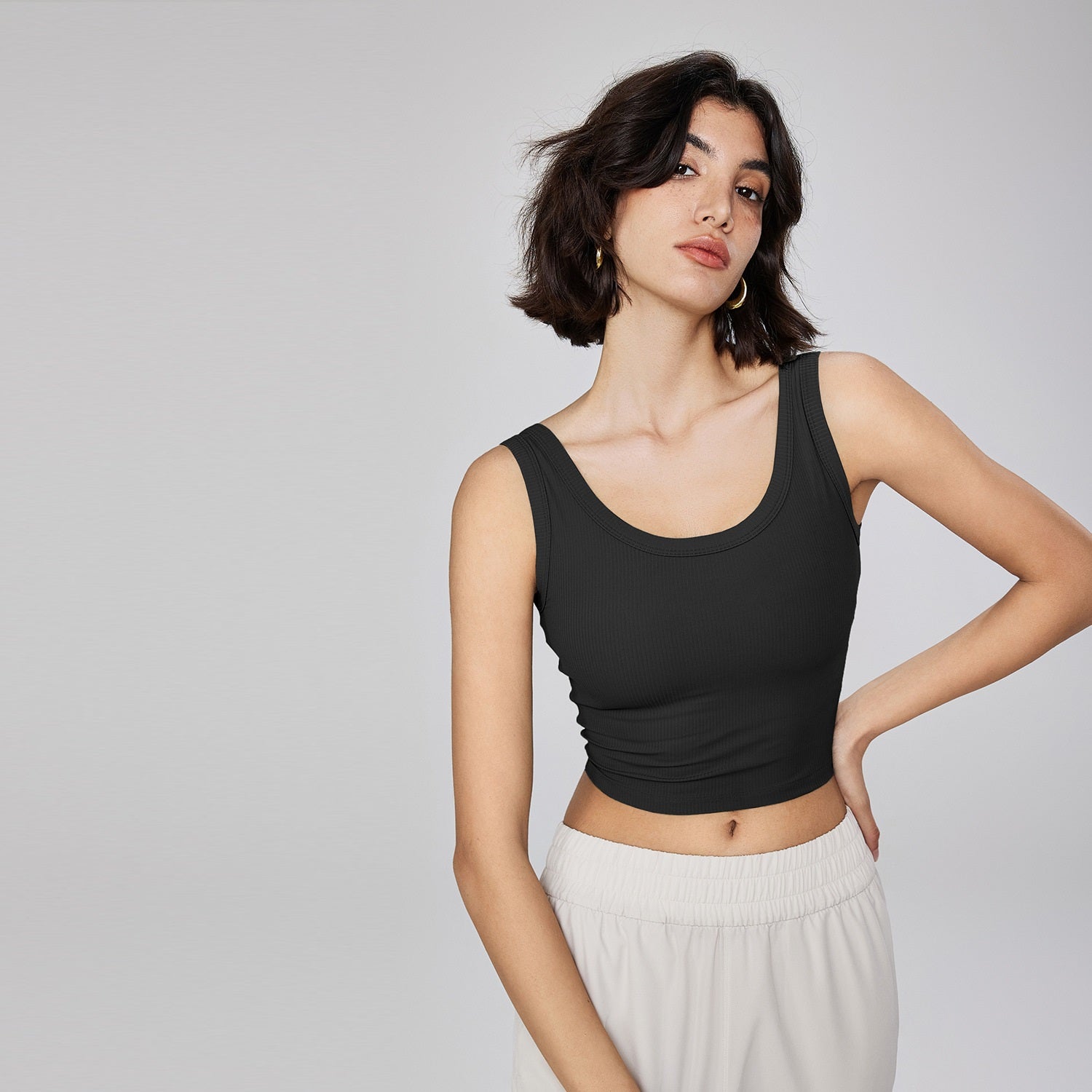 Features: Ribbed round neck, deep U back, widened shoulder straps